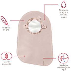 - Apertura intencional en el dorso de la cubierta que permite que el agua acumulada durante el baño se drene, sin afectar el desempeño de la bolsa